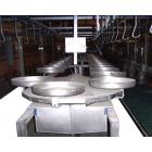 ②工作原理:由人工从猪体内分离出的红白内脏分别挂在吊钩和放在卫检盘中,进行检疫。然后将红白内脏输送到预定位置,红内脏设有自动脱钩装置,白内脏设有自动翻盘装置。***后吊钩、卫检盘进入清洗消毒装置,准备下一次的循环使用。