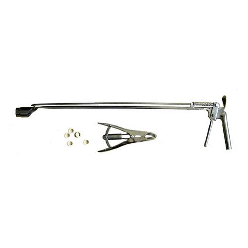 【简单介绍】用于将牛或羊的食管掏出,然后将结扎环夹在食管上,以防止胃留物在后续加工过程中倒流出来污染胴体。食管结扎器为不锈钢制造。包括以下附件:胀钳、5000个结扎环