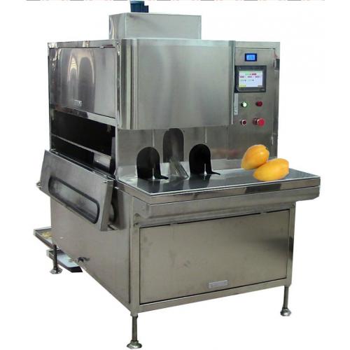 本机按欧盟标准制造,程序控制加远程控制,2012年获欧盟CE认证,2014年获广东省科学技术一等奖。操作时,点击触摸屏,设定参数,把芒果放进果座,机器就自动完成送果-定果-削皮-出料分离。是工业化加工芒果干、片、脯、丁、条、块、酱、汁、粉、罐头、速冻丁、鲜切的关键设备。