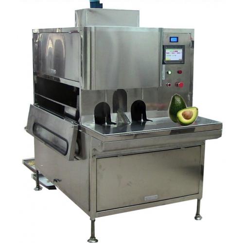 本机按欧盟标准制造,程序控制加远程控制,2012年获欧盟CE认证,2014年获广东省科学技术一等奖。操作时,点击触摸屏,设定参数,把牛油果放进果座,机器就自动完成送果-定果-削皮-出料分离。是工业化加工牛油果块、沙拉、奶昔、酱、汁、鲜切等的关键设备。