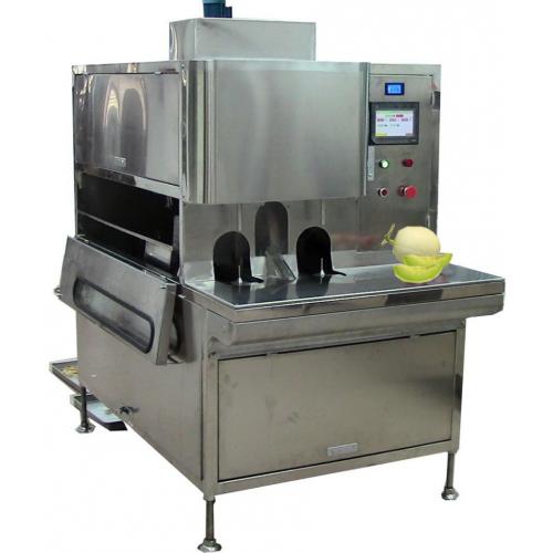 本机按欧盟标准制造,程序控制加远程控制,2012年获欧盟CE认证,2014年获广东省科学技术一等奖。操作时,点击触摸屏,设定参数,把甜瓜放进果座,机器就自动完成送瓜-定瓜-削皮-去籽-切瓣-出料分离。是工业化加工甜瓜块、丁、片、干、汁、鲜切等的关键设备。