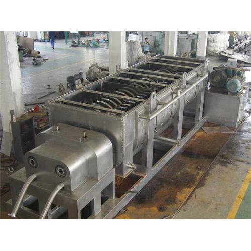 浆叶式干燥器是一种在设备内部设置搅拌浆,使湿物料在桨叶的搅动下,与热载体以及热表面充分接触,从而达到干燥目的的低速搅拌干燥器,结构形式一般为卧式,双轴或四轴。浆叶式干燥器分为热风式和传导式。热风式即通