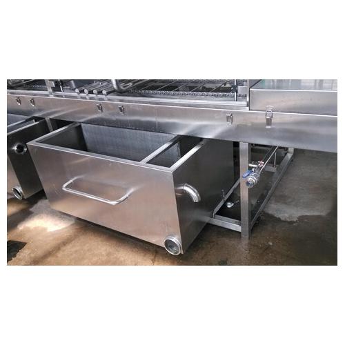 设备原理:需清洗的周转筐由不锈钢链条输入清洗机中,依次通过加温老碱水→高压热水→常温自来水→消毒水→常温风刀去水等多道工序,将筐子清洗干净,同时完成杀菌及风干;特殊筐子清洗时可在热碱水清洗段后加配毛刷,对筐子底部及左右两侧进行刷洗,提高清洗效果;采用连续式清洗,以提高清洗效率。